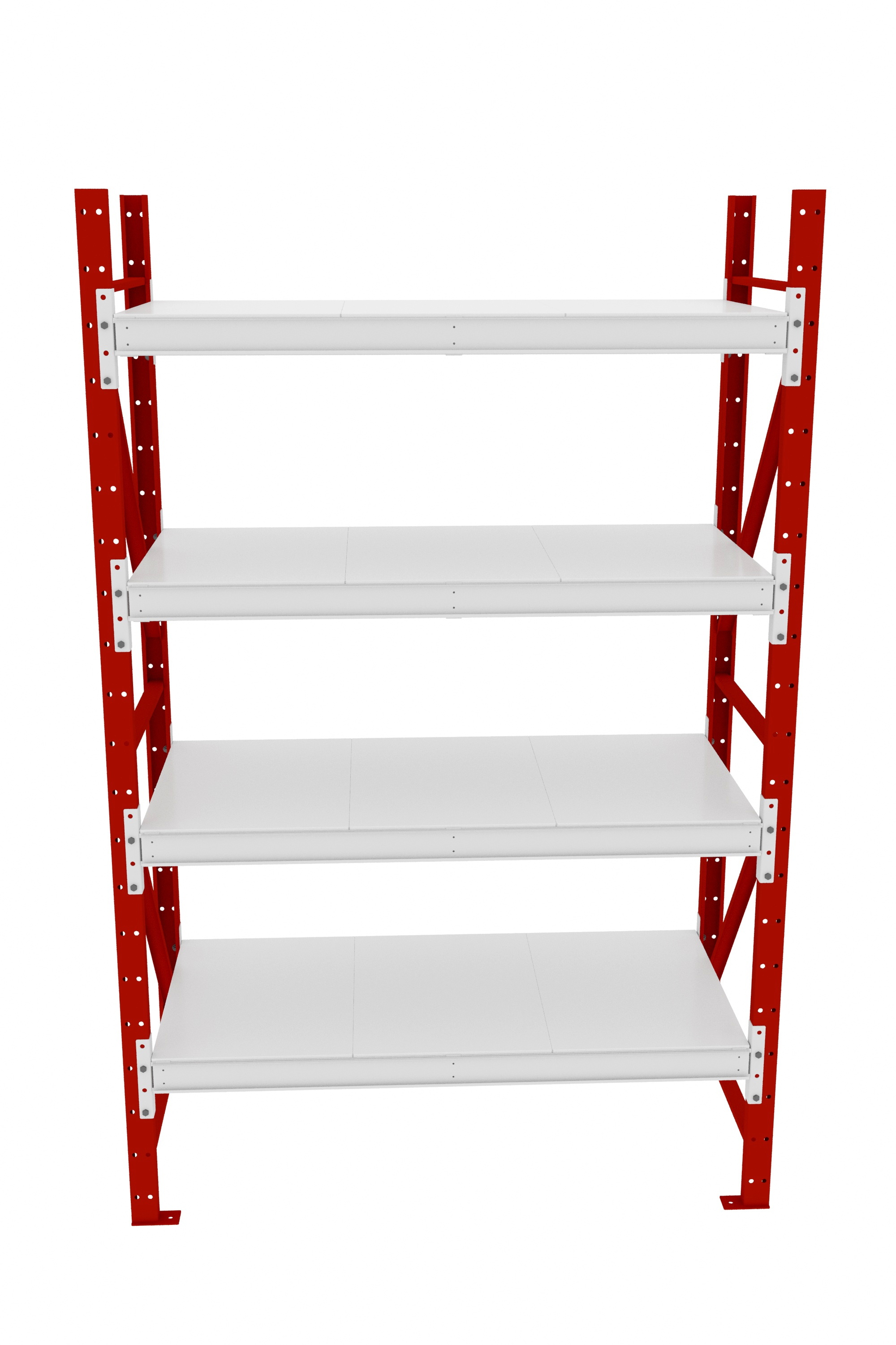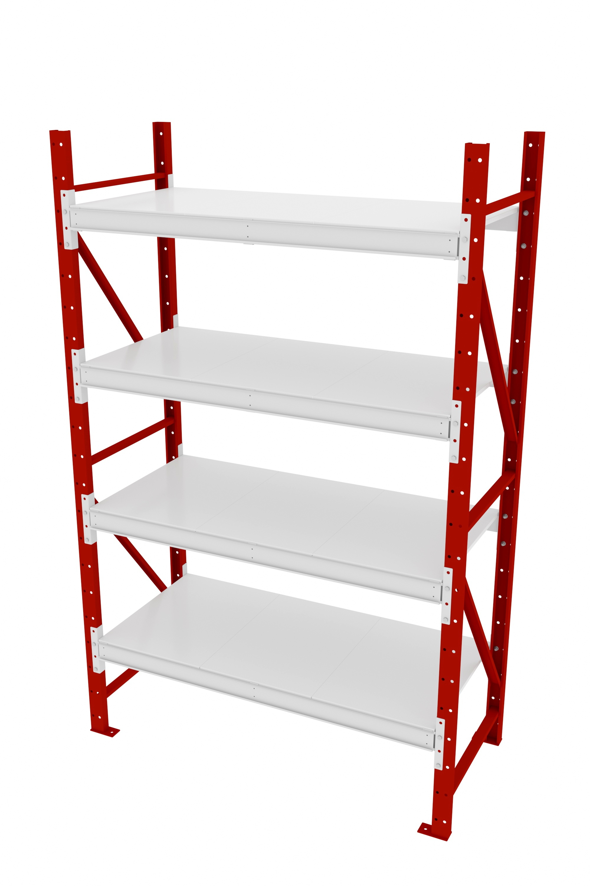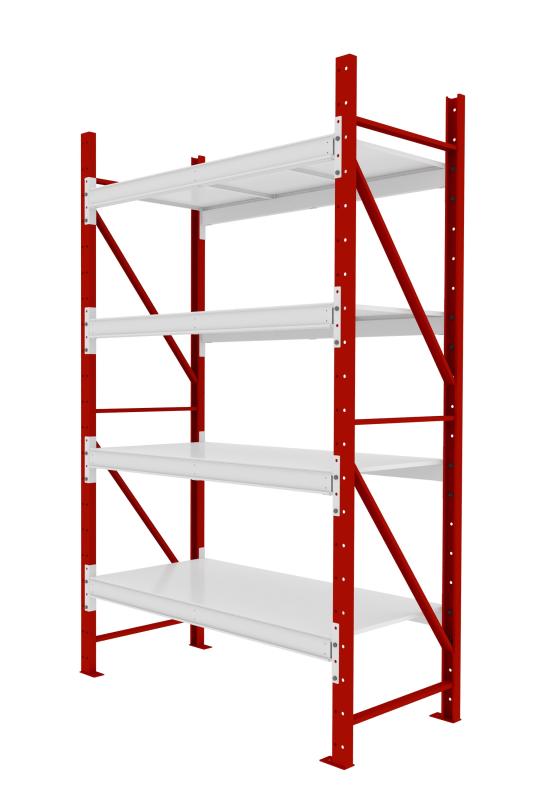 Базовая секция стеллажа состоит из перфорированных стоек, уровней из ригелей (основание наборной полки) и полок. Загрузка фронтальная. Максимальная нагрузка на уровень до 450 кг, на секцию - до 1800 кг.