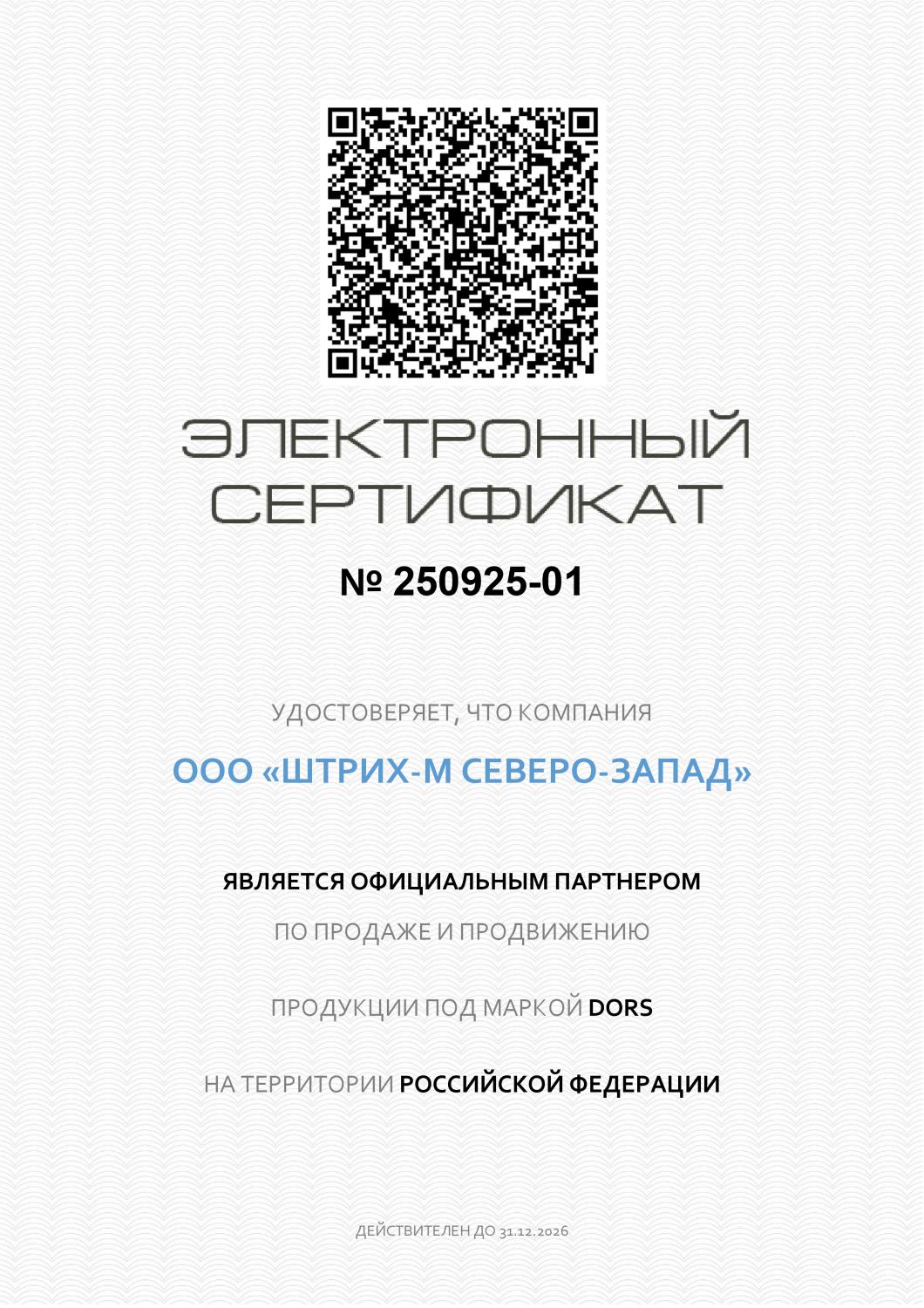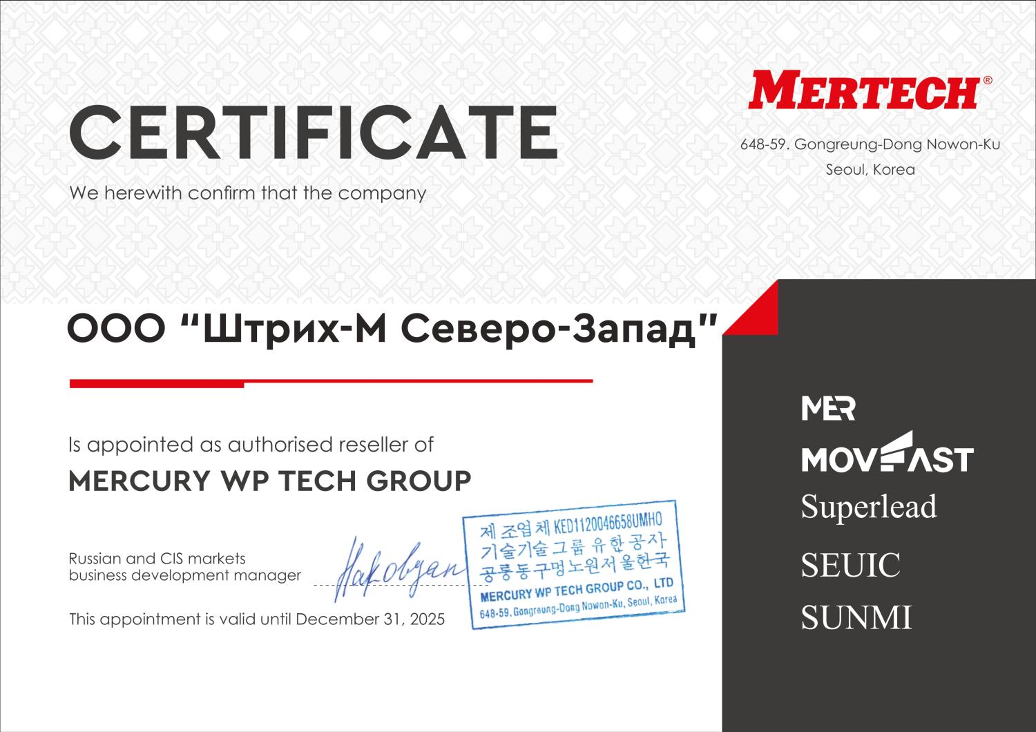 Сертификат удостоверяет, что компания ООО «Штрих-М Северо-Запад» является официальным партнером по продаже и продвижению продукции под марками M-ER , Movfast, Superlead, Seuic, Sunmi